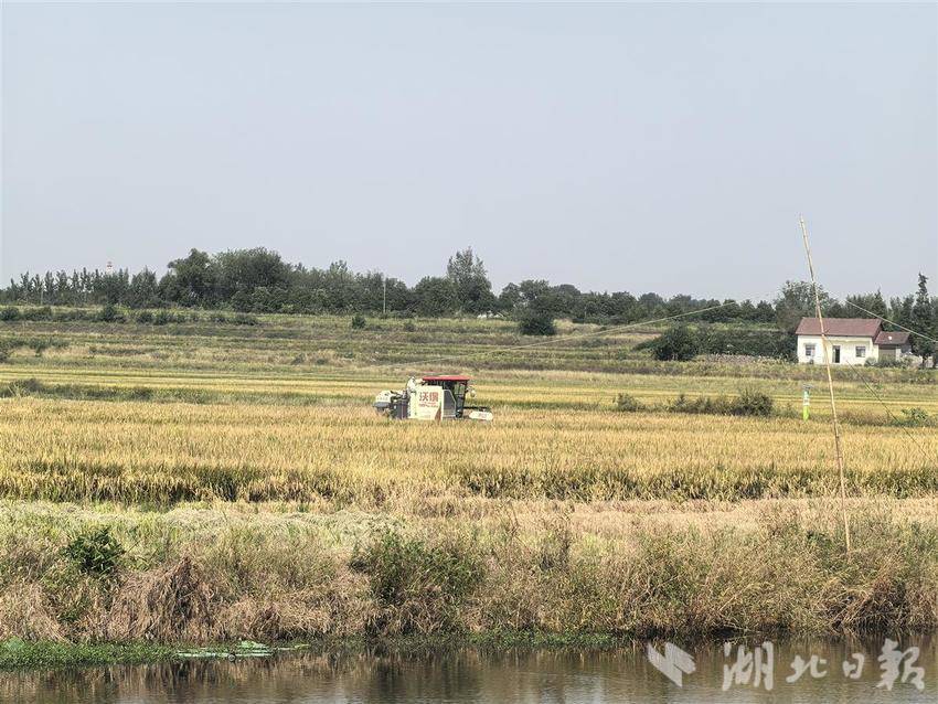 9月26日,当阳市淯溪镇刘河村。金色稻田一望无际,收割机往来穿梭。
