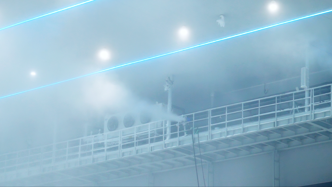 在雪场的出入口已经可以明显感觉到寒气扑面而来,穿上专业的防护服后通过感应门,走进滑雪场内部,白茫茫一片的滑道呈现在眼前,地面已经可以看到很厚的雪层,24台造雪机正在一刻不停地进行着造雪作业,为早日达到滑雪标准开门迎客全力冲刺。