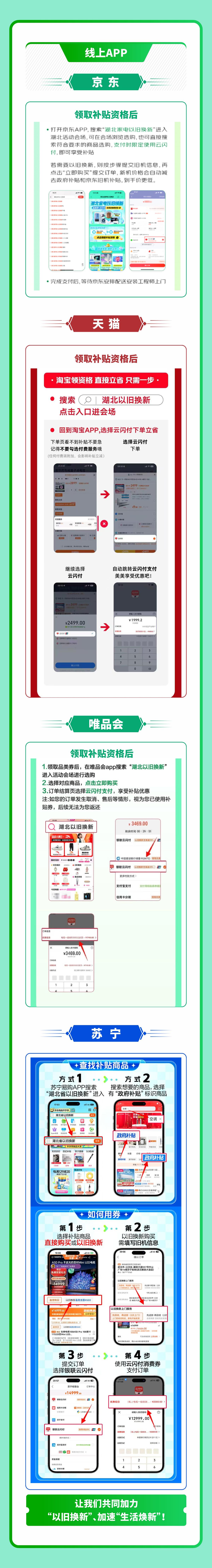 8月10日,湖北省在全国率先实施加力支持家电以旧换新工作,补贴力度翻倍。消费者在指定线下门店、指定线上电商平台参与家电以旧换新活动,可享每类最高2000元优惠补贴,8大品类至高可享16000元。活动覆盖省内6000多家品牌商户,包含百余城市、触达上千乡村。