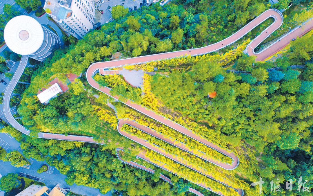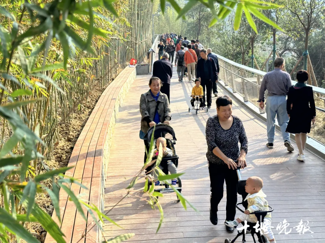健康步道将山体、文体场馆、居民小区串联。站在健康步道登高望远,满山苍翠、欣欣向荣,一城繁华、尽收眼底。