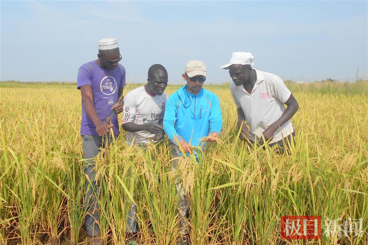 梁遂权与非洲农技员在稻田里讨论种植技术