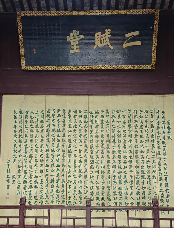 二赋堂内展示的木刻作品《前赤壁赋》,以楷书书写,风格豪迈俊逸;《后赤壁赋》则融合了汉隶与魏碑两种书体,笔力苍劲有力。