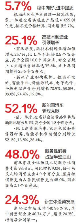 从关乎发展质量的指标看,前三季度,高技术制造业增加值增长25.1%,比上半年加快0.5个百分点,高于全国16.0个百分点,对全省规上工业增长贡献率达35.8%,比上年同期提升25.6个百分点。以新能源汽车、锂电池、光伏“新三样”为代表的绿色产业产量保持两位数增长,表明经济发展质量稳步提升。