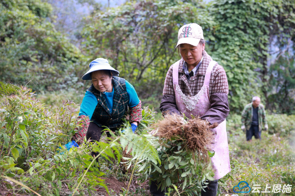 在咸丰县小村乡李子溪村,中药材种植户杨启超种植的60亩咸丰白术已成熟。当地40余名村民忙碌在田间地头,趁着晴好天气帮他抢收白术。扯起术块、抖净泥沙、剪去术杆,一篓篓白术被装入袋子打包运下山,再由村民拔除根须装袋后,等待收购商前来收购。