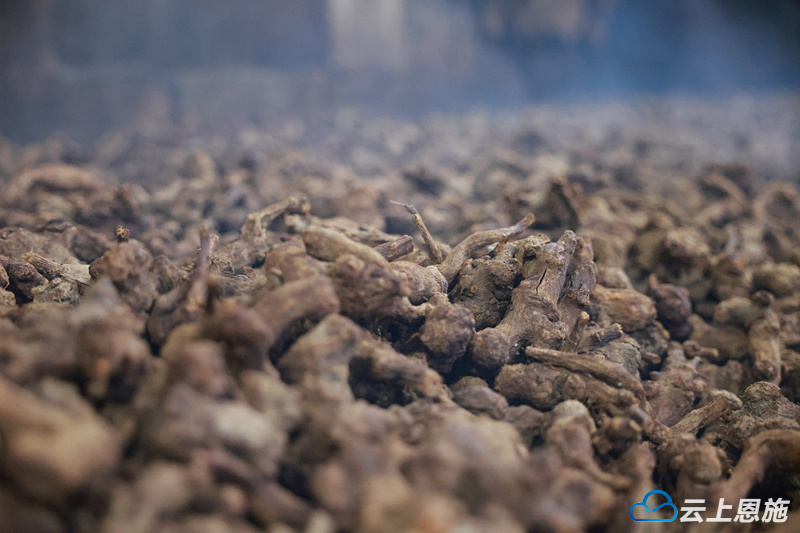 走进位于小村乡土地溪村的一间烘炕房内,咸丰白术堆积如小山丘,到处弥漫着药材的香气。工作人员忙着进行白术烘炕作业。经过严格控制温度和时间的烘炕过程,白术逐渐干燥,保留了最佳的药效和品质。