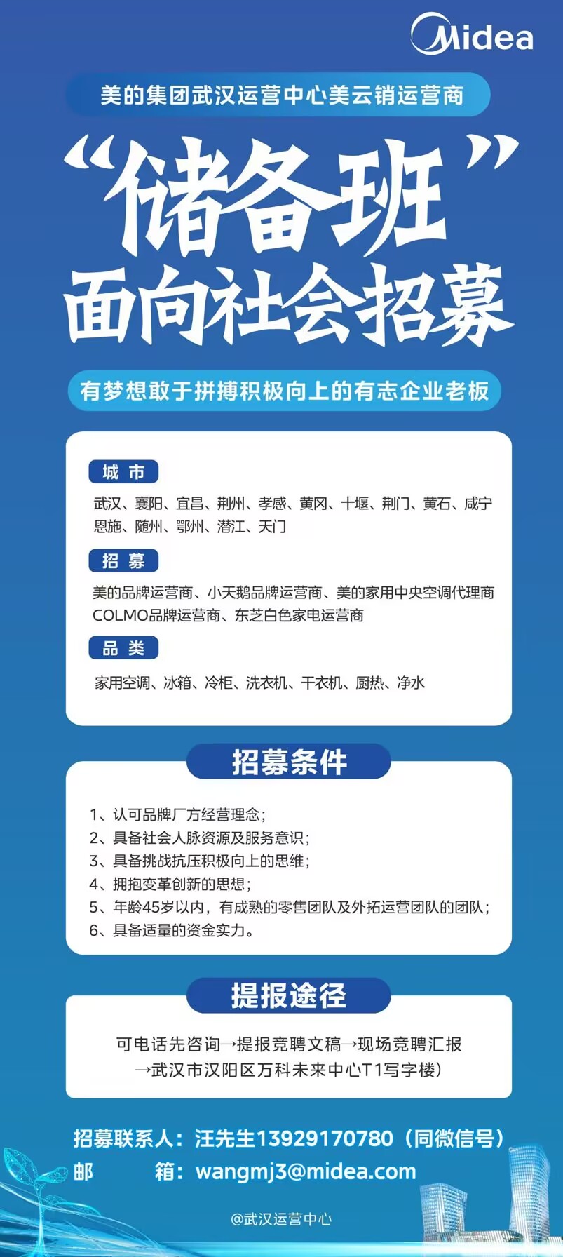 招募范围涵盖湖北省内武汉、咸宁、孝感、随州、黄冈、黄石、鄂州、天仙潜、荆州、荆门、宜昌、恩施、襄阳、十堰的美的品牌运营商、小天鹅品牌运营商、美的家用中央空调代理商、COLMO 品牌运营商、东芝白色家电运营商。
