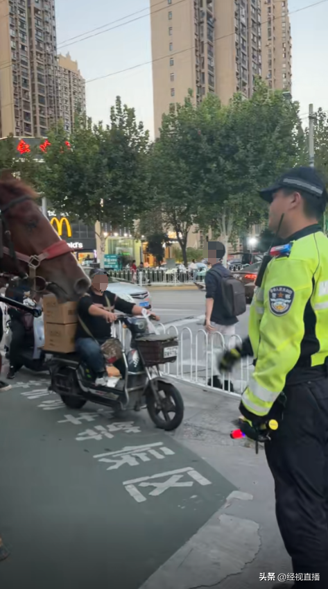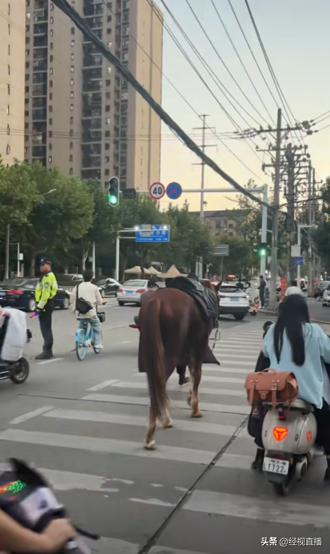 网友视频显示,这名男子曾骑马出现在武汉市硚口区古田四路附近,在一处路口被执勤交警劝下马,男子随后牵马过马路离开。