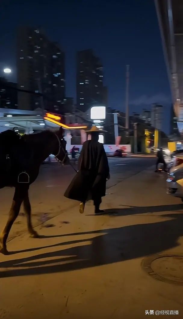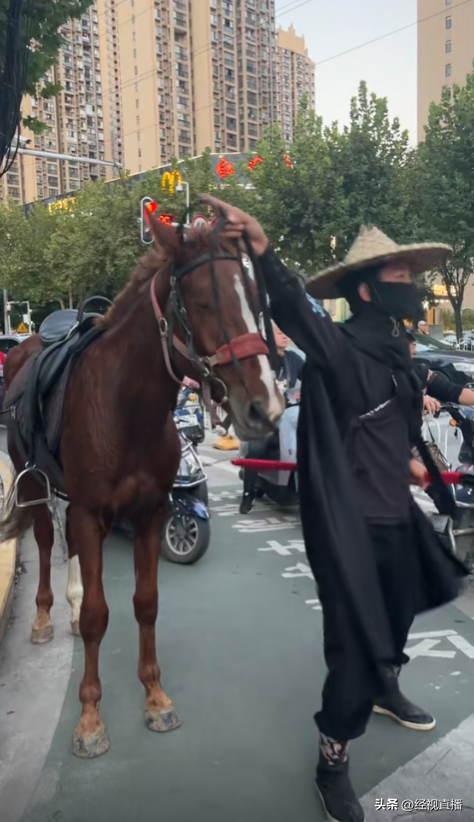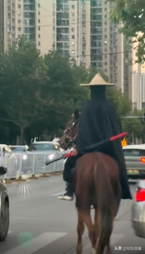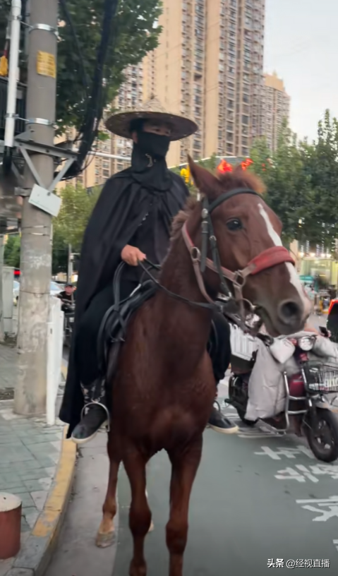 近日,有不少武汉市民在街头遇到一名“大侠”装扮的骑马男子,头戴斗笠一袭黑衣,仗剑策马颇具侠意。