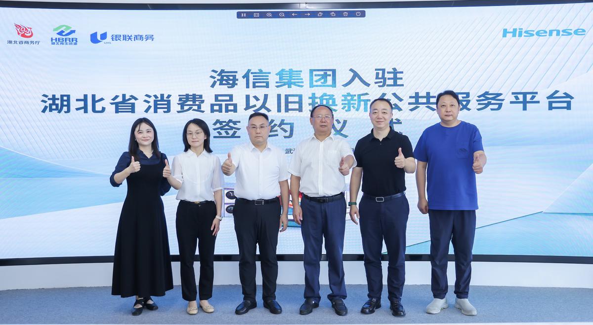 9月,在湖北省商务厅指导下,湖北省再生资源集团有限公司、银联商务支付股份有限公司湖北分公司、海信(武汉)销售有限公司举行三方签约,海信集团在湖北的1000余个销售网点可让更多居民在家门口以旧换新。海信(武汉)销售有限公司总经理李春辉介绍,入驻“湖北省以旧换新公共服务平台”后,消费者可线上下单,就近网点提货。