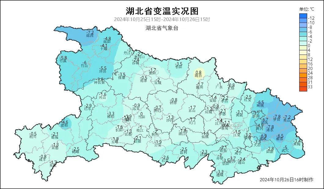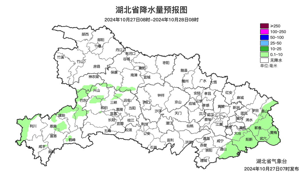 27日08时-28日08时,鄂东南零星小雨转多云;其他地区多云,其中鄂西南局地有零星小雨。最高气温19~24℃,最低气温10~15℃,偏北风3到4级、阵风5到7级,夜间转2到3级。