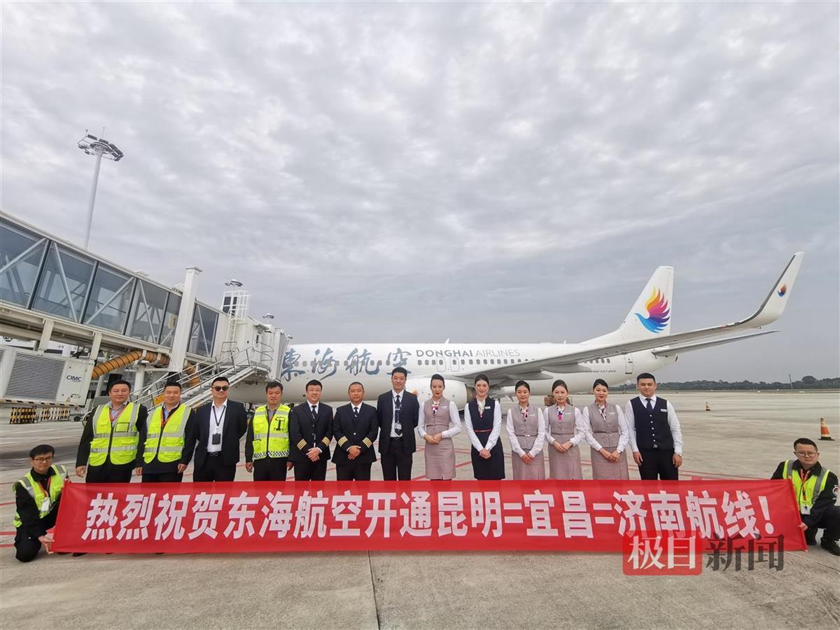 昆明=宜昌=济南航线由东海航空执飞,航班号为DZ6369/DZ6370,班期1357,具体航班时刻为昆明起飞09:55,抵达宜昌11:45,宜昌起飞12:45,抵达济南14:45;济南起飞17:05,抵达宜昌19:00,宜昌起飞19:50,抵达昆明22:05。