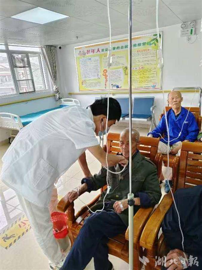 浠水县失能人员康养照护中心由原浠水县妇幼保健院闲置资产改造而成,开张不到一年,已入住250多位老人。浠水县妇幼保健院11名医护人员也“住进”该中心,每天早上到老人房间进行健康巡查,做好日常监测,一旦老人发病,可第一时间转入医疗区,待病情好转稳定后再回养老区,这样做让老人安心家属也放心。“70岁的程水权患肝衰竭,黄疸指数很高,从大医院回来后,通过中医治疗恢复得很好,现在能自由活动。”医生夏晓峰说。