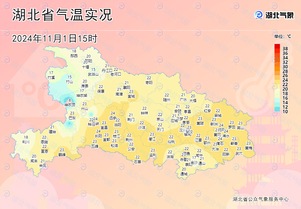 11月3日08时-4日08时,全省晴天间多云。最高气温22~26℃,最低气温10~13℃,偏北风2到3级。4日08时-5日08时,全省晴天间多云。最高气温西部19~22℃、东部22~25℃,最低气温鄂西北6~9℃、其他地区10~13℃,偏北风3到4级、阵风5到7级。