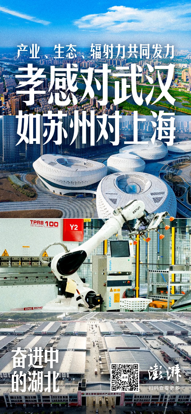 “孝感区位优势突出”,中国城市经济学会副会长、长江经济带智库联盟秘书长秦尊文近日向澎湃新闻(www.thepaper.cn)指出,孝感紧贴武汉都市圈圈心,又紧邻襄阳都市圈、宜荆荆都市圈圈域,正好处于三大都市圈构成的“金三角”中心地带。若以地理位置而论,孝感于武汉,如苏州于上海;从叠加的区位优势与辐射效应来看,孝感于湖北,如同要成为长三角“白菜心”的马鞍山。