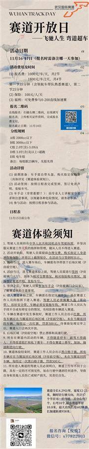 本次赛道开放日共两天,为11月16日至17日。报名者需交纳一定的报名费用,还需自戴头盔、购买保险,可免费参与0—200米直线加速赛。有兴趣参加的市民可登录“WHIC武汉国际赛道”微信公众号报名。