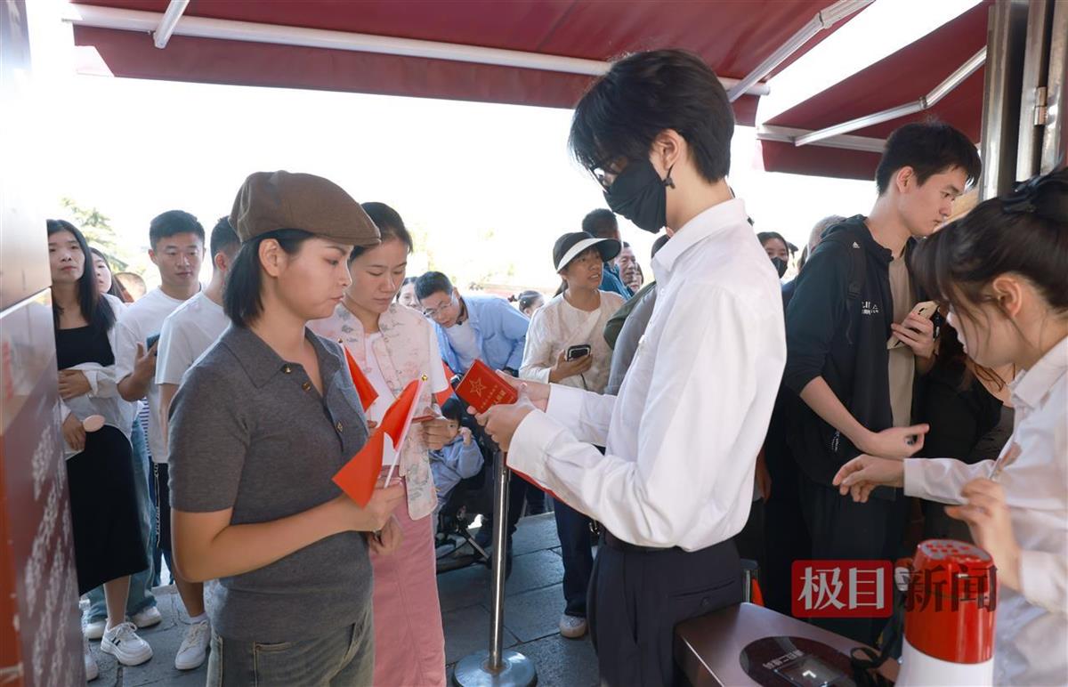 黄鹤楼景区工作人员查验文职人员证件,提供免费入园服务