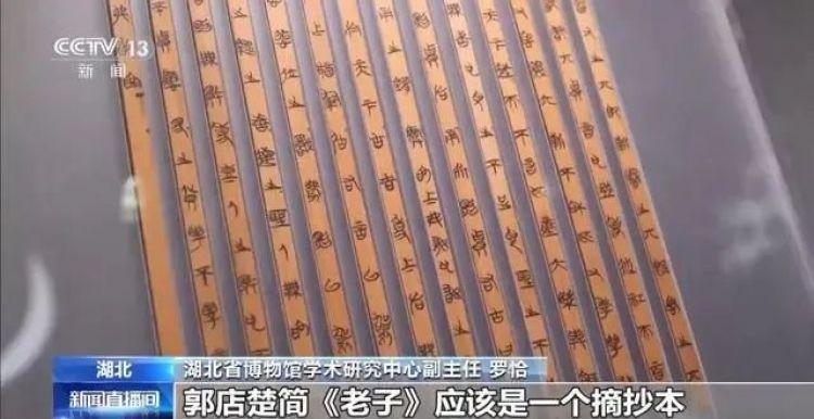 湖北省博物馆学术研究中心副主任罗恰:郭店楚简《老子》应该是一个摘抄本,它不是全本,它篇章的分章、次序跟我们现在所流行的传世本《老子》有不同。我们现在的传世本《老子》它是分《道经》和《德经》的,郭店楚简(《老子》)它是不分的,它的面貌比较原始、比较古老。