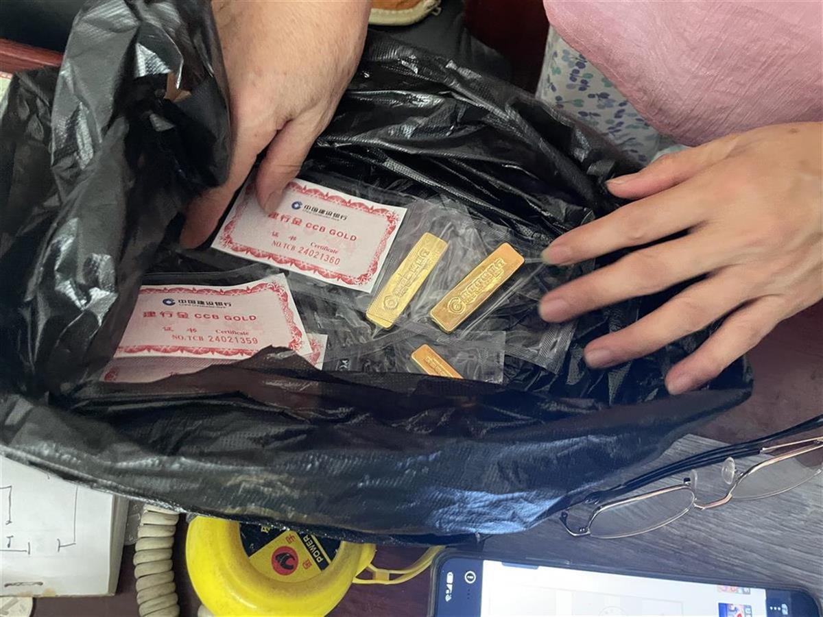 武汉市反电诈中心民警介绍,10月1日,黄陂区一位老人接到假警察的电话,声称其涉嫌一起特大诈骗案。老人受到惊吓,同意配合对方“调查”。骗子要求老人把存款转入同一张银行卡,共有100万元。骗子要求老人在手机上购买了1600克黄金,填写收货人为广西玉林市的一名陌生人。黄陂区公安分局反诈中心启动警银合作机制,在市、区两级公安机关紧密配合下,成功拦截了正在运输途中的1600克黄金快递包裹。该包裹随即被运回黄陂区公安分局腾龙派出所,民警亲手交还给老人。
