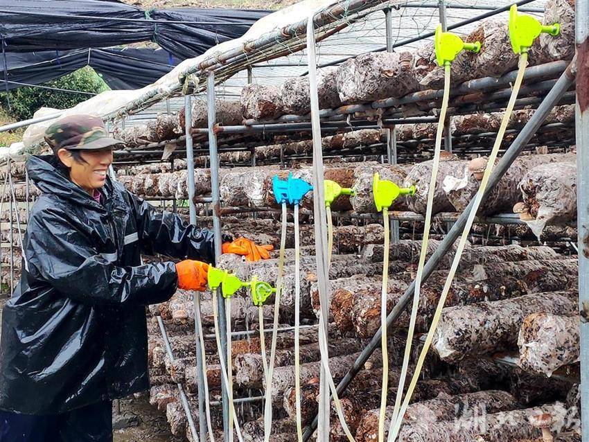 插入、注水(保持香菇的湿度和温度,促进其生长的种植方式)、拔出、换棒,再插入、再注水、再拔出、再换棒……在香菇棚里,一位身穿防水服的妇女正在熟悉地、快速地给采摘后的香菇菌棒注水。“现在只用了10个针头,要是热天需要30个针头轮流更换注水。注水每棒6分钱,昨天我才注了7000棒。”注水妇女边忙边笑着说。