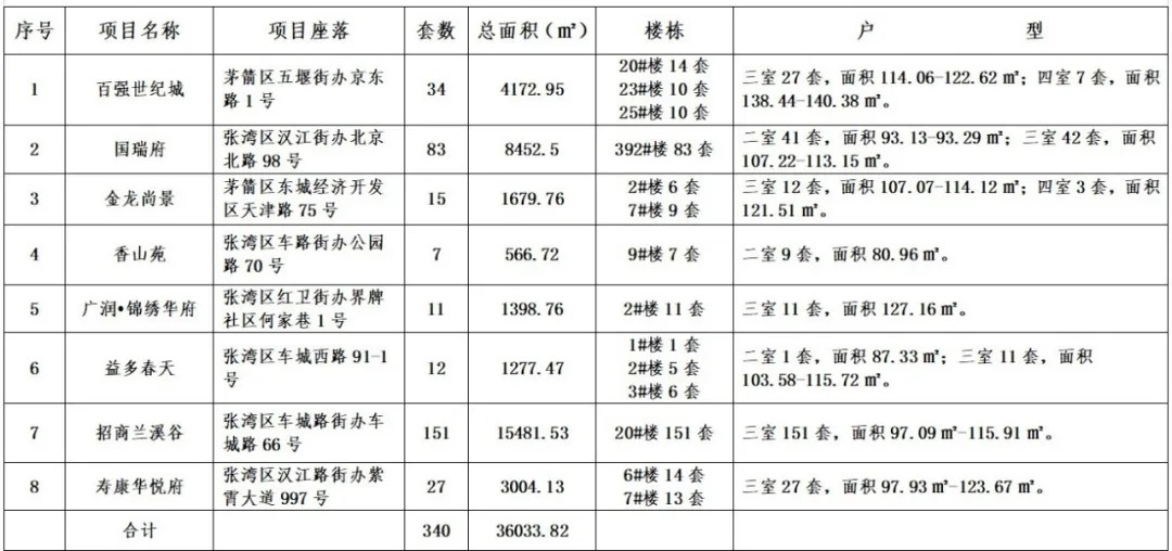 其中,毛坯房340套。分别为百强世纪城34套、国瑞府83套、金龙尚景15套、香山苑7套、广润锦绣华府11套、益多春天12套、招商兰溪谷151套、华悦府27套;已装修且已配租入住人才住房(公寓)228套。分别为芳华里、华西新城、楚天都市熙园,经承租人申请,只能购买已承租的房屋。