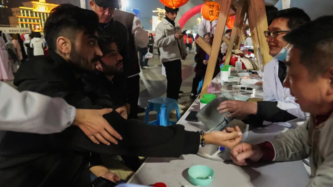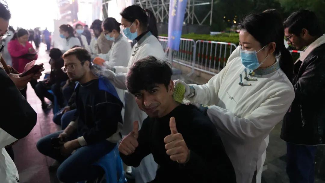 “中医药文化夜市+膏方节”,市中医医院医护人员变身“夜市摊主”,或手法娴熟地为市民提供艾灸、耳穴压豆、推拿等中医特色服务,或深入浅出地为市民介绍膏方的组成、使用及功效。现场的中药香囊、养生锤、中医药代茶饮等中医药主题产品备受市民青睐,简、便、廉、验的中医适宜技术更是让到现场观摩、体验的湖北科技学院留学生深感神奇,来自巴基斯坦的留学生Jinza用英文连比带划地询问医护人员:“我怎样才能成为一名中医?”