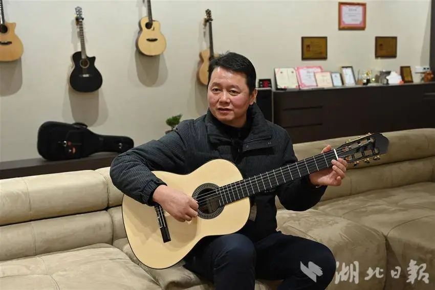 松滋地处江汉平原西南边缘,以往,外国游客很少见。如今,因为一把吉他,金发碧眼的“老外”频频到访。去年10月至今,松滋已接待英、美、荷等7国的20批次外国客商。11月27日,湖北日报全媒记者也来到桐馨乐器的办公大楼,就听到吉他的乐声从楼上传来。循声走进位于2楼的办公室,只见一位精干的中年男人坐在沙发上,拨动着怀里的吉他。