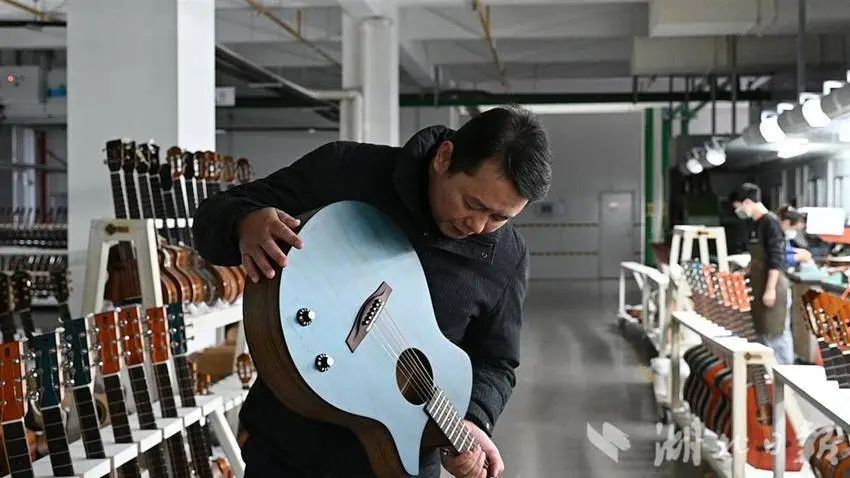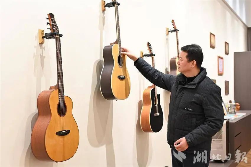他就是汪锋华,土生土长的松滋人。1995年,21岁的汪锋华从部队退伍后,辗转多地打短工。2003年,他来到广州市花都区一家吉他厂打工,自此与吉他结缘。之后几年,汪锋华在花都区的多个吉他厂积累经验,从仓库管理员起步,一路做到生产厂长,“吉他制作的每个工序都了然于胸”。他注意到,国内的工厂大多生产低端吉他,附加值不高;而更赚钱的中高端吉他则主要产自英美德等发达国家。“咱们中国人完全可以造出世界最高端的吉他。”2010年,汪锋华与同样在花都区吉他厂打工的两位老乡一起自主创业,桐馨乐器就此成立。“‘桐馨’谐音‘同心’,寓意同心奋进、携手同行。”凭借在行业多年的历练及娴熟的工匠技艺,桐馨乐器逐渐站稳脚跟,生产的吉他赢得欧美等地的多国知名乐器商的认可。2019年,公司销售收入达到8000万元。随着订单不断增长,桐馨乐器原有的厂房已不能满足需求,急需扩大产能。与此同时,在“腾笼换鸟”政策下,一些传统制造业陆续从广州城区迁出,汪锋华团队决定为桐馨乐器寻找更合适的落脚点。获知消息后,“中国吉他之都”贵州正安县、“吉他小镇”湖南东安县等地纷纷向桐馨乐器抛出“橄榄枝”。最终,在松滋招商团队感召下,汪锋华团队选择回到家乡。2023年9月,公司总部及生产车间迁往松滋。