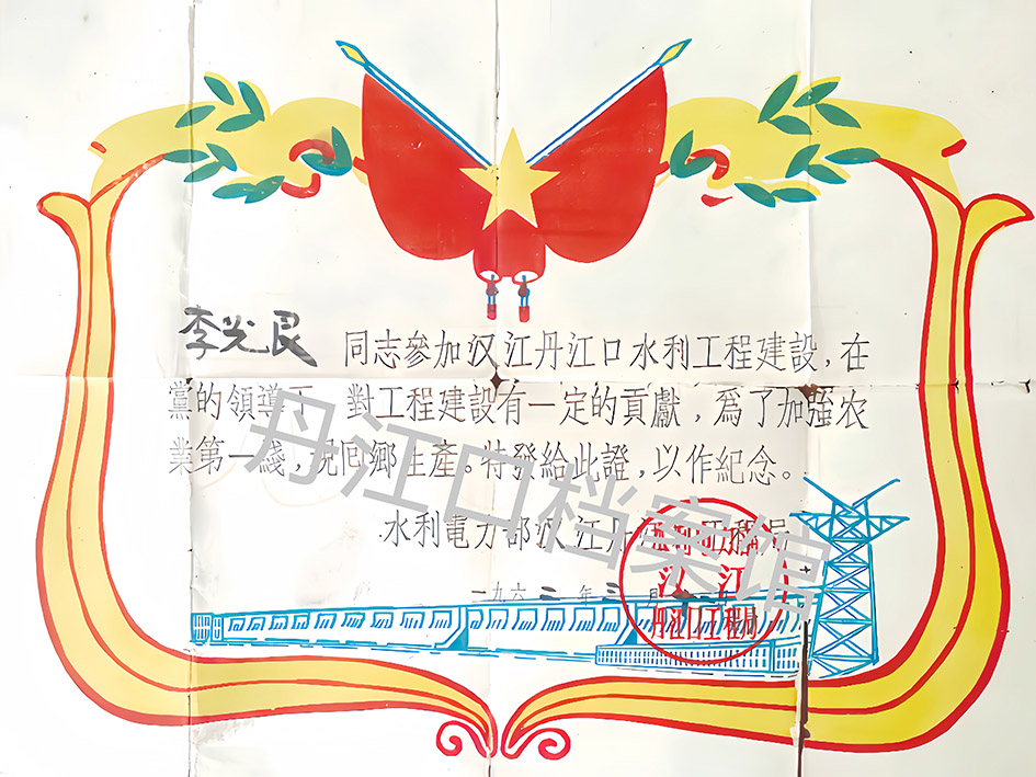 在丹江口市档案馆,收藏着一张泛黄的证书。这张证书上写着:“李光艮同志参加汉江丹江口水利工程建设,在党的领导下,对工程建设有一定的贡献,为了加强农业第一线,现回乡生产。特发给此证,以作纪念。”落款为水利电力部汉江丹江口工程局。