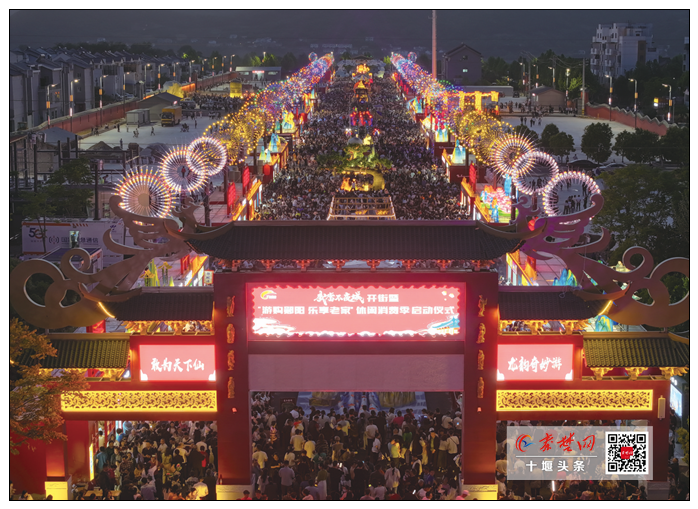 深秋夜幕降临,郧阳区柳陂镇龙韵村的“武当不夜城”灯光璀璨,文艺节目接连上演。人流如织,或驻足欣赏,或亲身体验,或品尝烤串啤酒。一年前,这里还是入夜便沉寂的小山村。