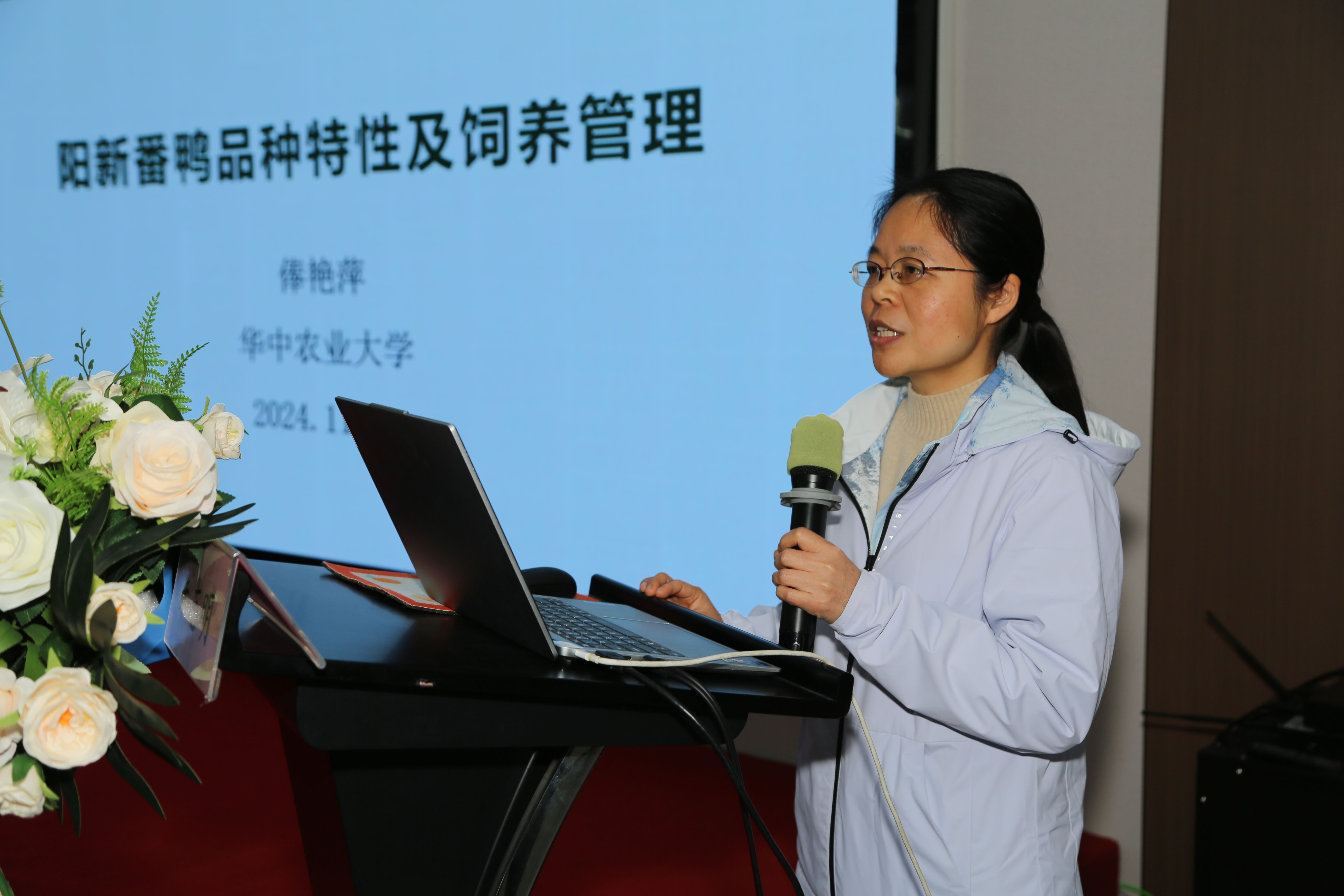 在全省家禽养殖技术培训班上,华中农业大学副教授俸艳萍介绍阳新屯鸟(学名番鸭)品种特性及饲养管理技术。图/张丕兴、王晨曲