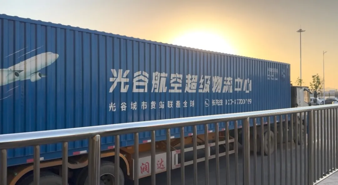 光谷航空超级物流中心专用集装箱货车驶入鄂州机场货站