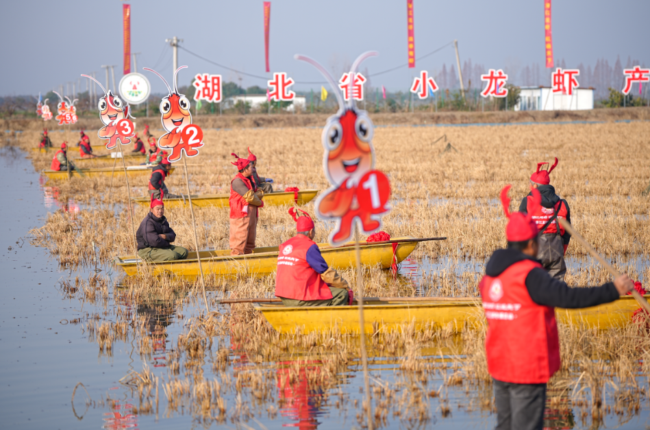 上午9时许,在潜江市后湖管理区虾稻共作立体模式试验示范基地,虾稻田里分割出8条赛道,虾农两人一组,撑着小船开始了冬虾捕捞竞赛。他们满心期待地拉起今冬第一网,虾笼一下被提起,活蹦乱跳的小龙虾也随之跃出水面——“潜江龙虾”冬虾正式上市!