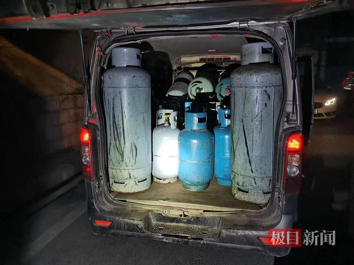 日前,武汉市黄陂城管直属一中队执法人员开展燃气安全整治行动中,在岱黄高速刘店立交附近发现一辆小型面包车,车内共装有液化气43瓶。