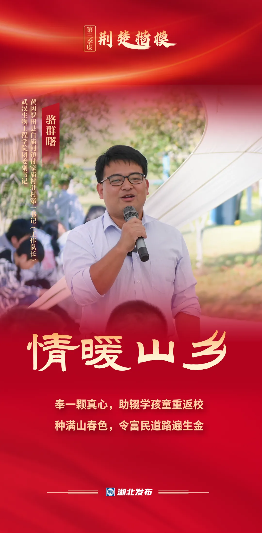 近日,“荆楚楷模”2024年第三季度上榜人物名单揭晓。武汉生物工程学院团委副书记、黄冈市罗田县白庙河镇付家庙村驻村第一书记(工作队长)骆群曙榜上有名。
