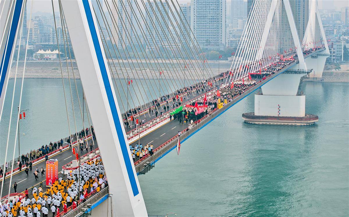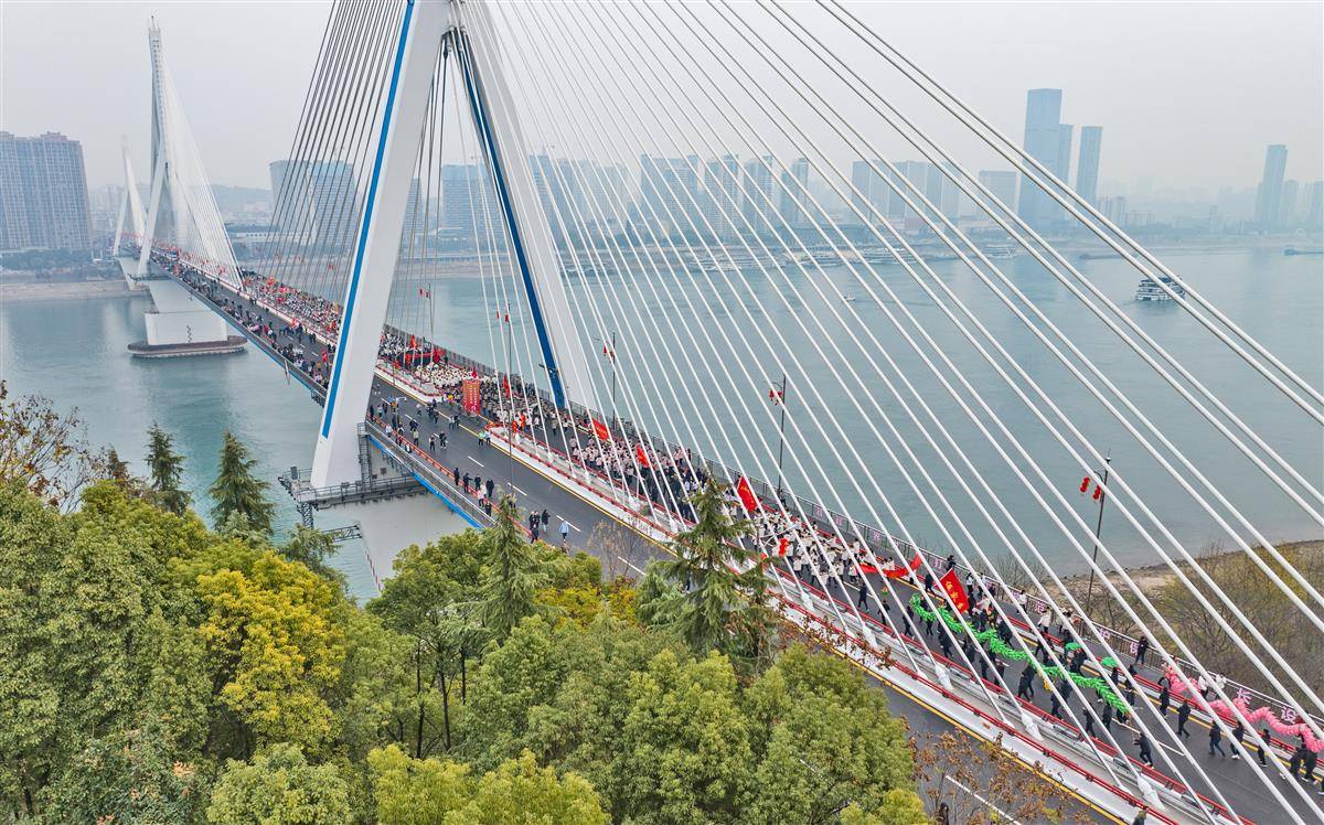 12月30日上午,宜昌万余名群众共同以奔跑的方式迎接即将到来的2025年,浩浩荡荡的长跑队伍跑步通过夷陵长江大桥。夷陵长江大桥是宜昌城区首座跨江城市桥,已建成运行23年,去年10月启动斜拉索更换工程,目前改造工程已全部完工,迎新长跑结束后,夷陵长江大桥恢复通车。(湖北日报全媒记者 刘曙松 摄)