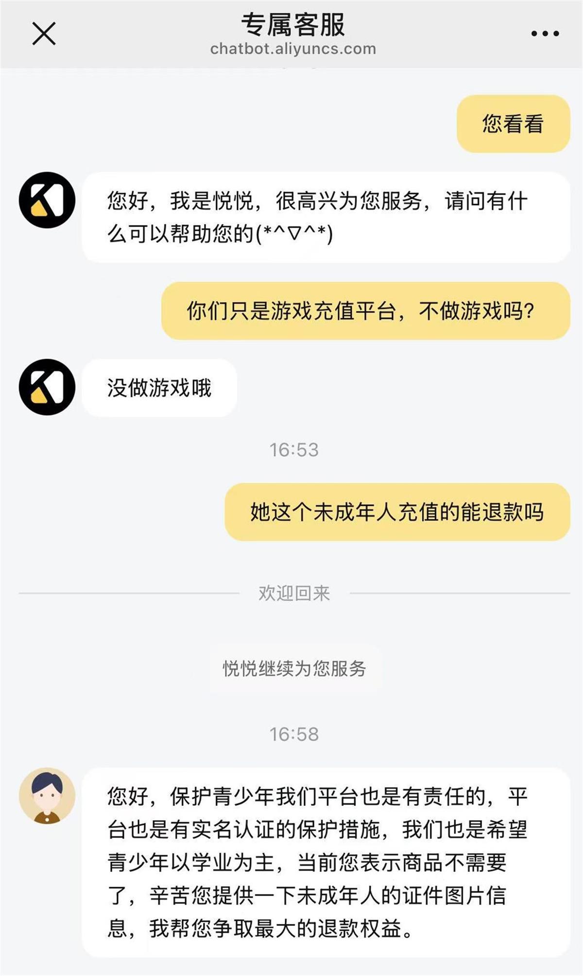 在向公司客服表明身份及来意后,该名客服表示,平台并没有做游戏产品,不涉及游戏的开放和运营,仅提供游戏充值服务。针对青少年的充值行为,客服表示,“平台是有实名认证的保护措施,也希望青少年以学业为主。”