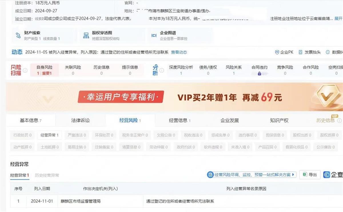 那么,通过游戏代充平台充值的钱,去哪了?记者仔细查看了廖女士提供的账单,发现游戏代充平台的收款账户,全称为云南曲靖一服装有限公司,与其注册名称并不相符。记者打开企查查APP搜索该公司发现,该公司通过登记的住所或经营场所无法联系,已于今年11月5日被有关部门列入经营异常。