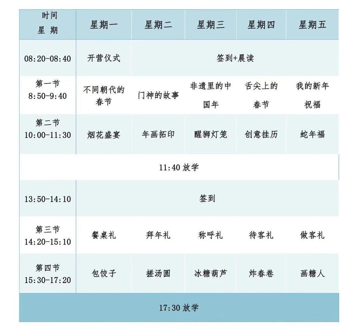 此次冬令营为期5天,1月14日至18日,课程包括年俗知识讲解和手工制作等。年俗知识有不同朝代的春节、门神的故事、非遗里的中国年、餐桌礼、拜年礼、待客礼、做客礼等;还有年俗非遗手工制作,有年画拓印、醒狮灯笼、冰糖葫芦、画唐人、蛇年福等。