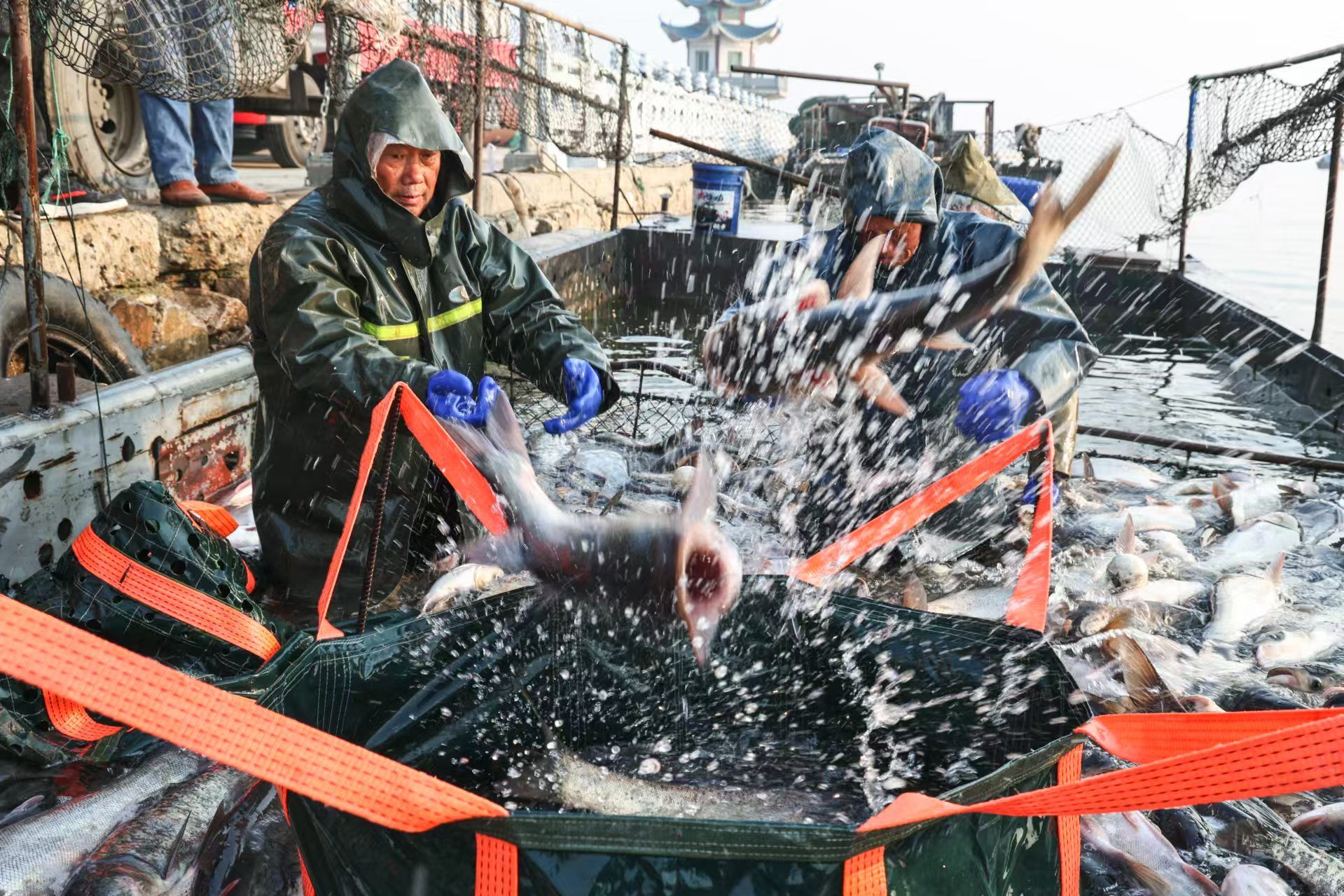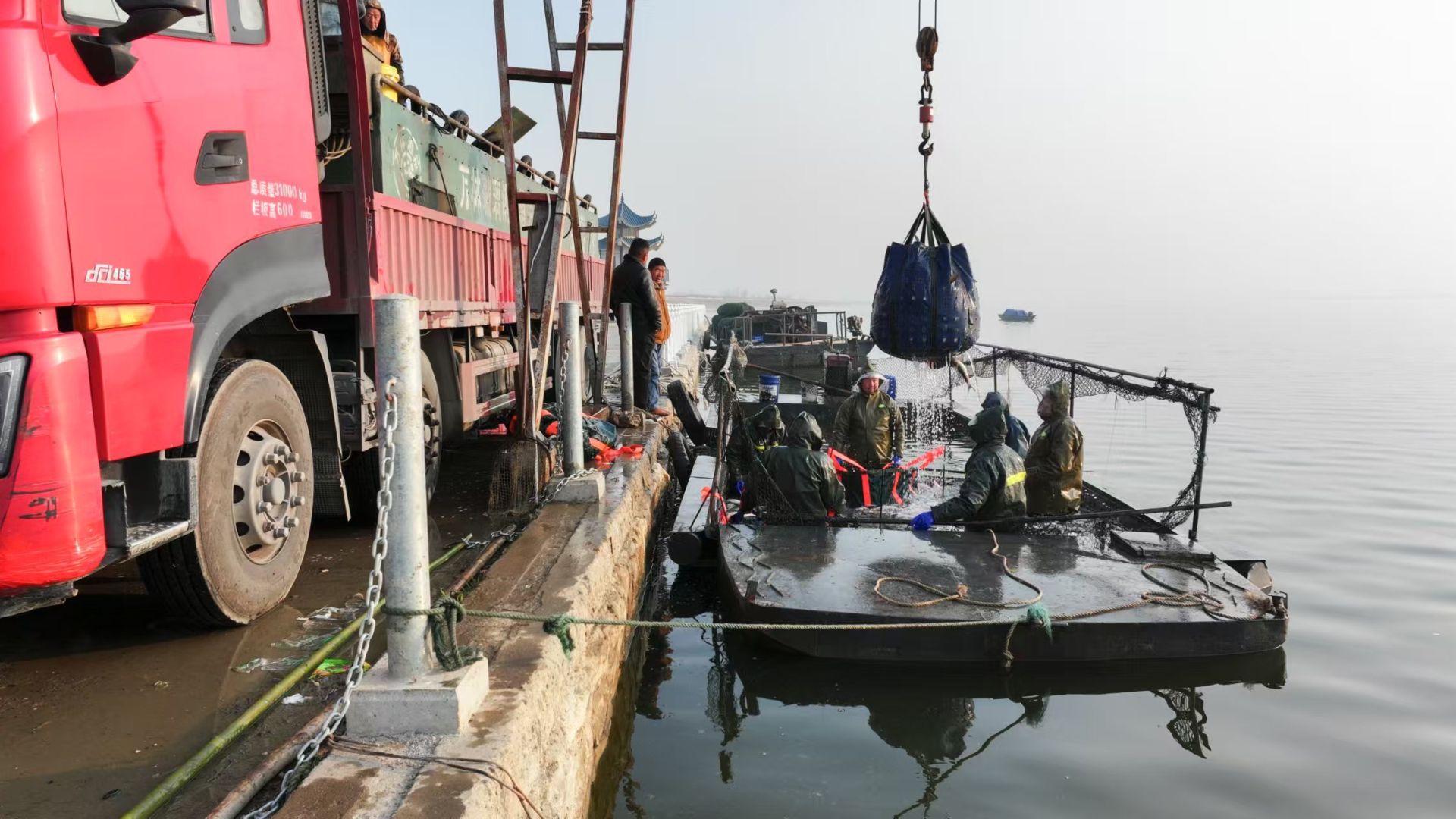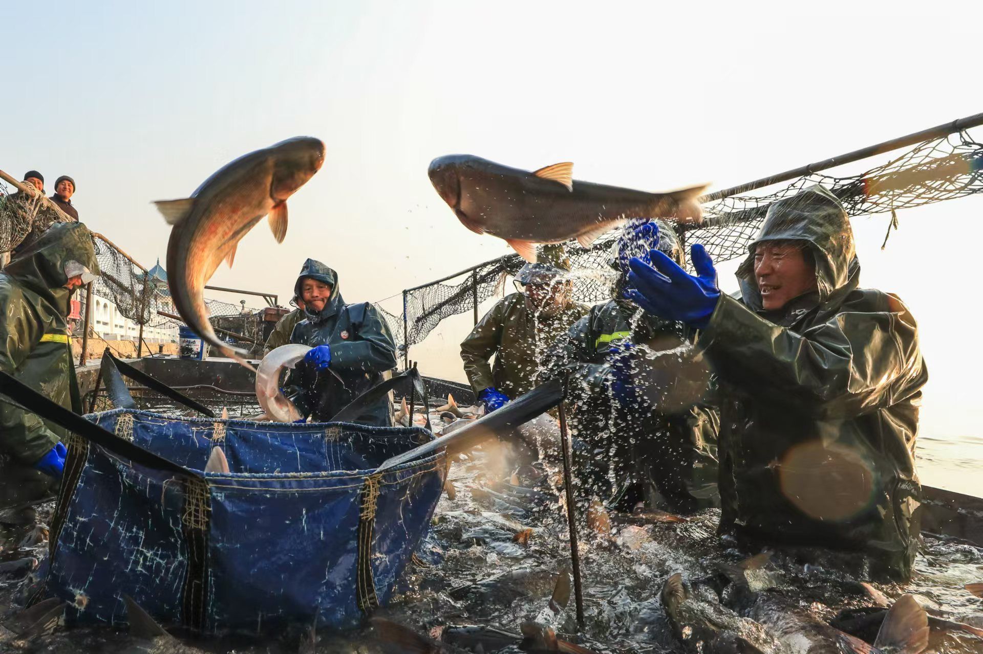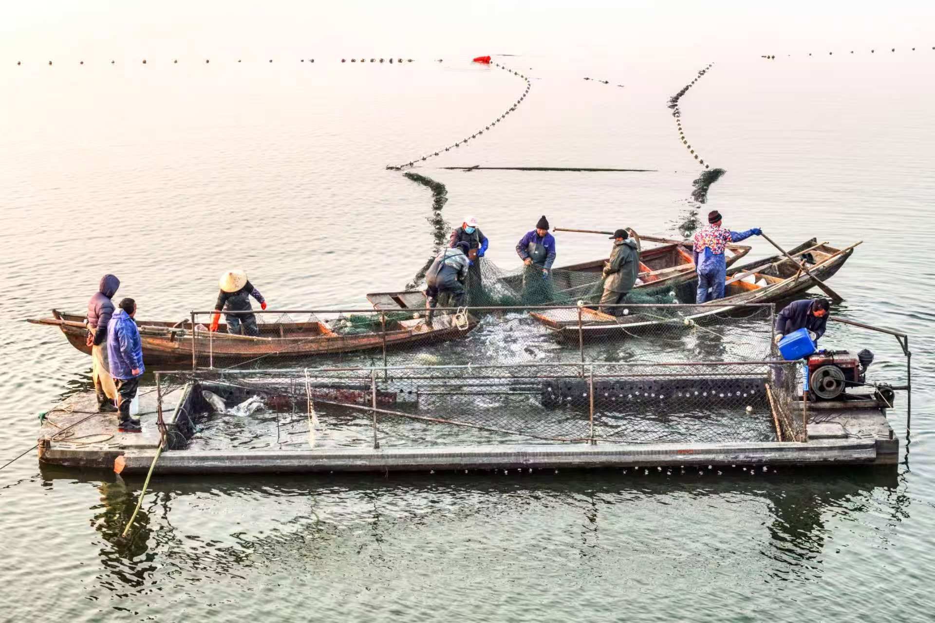 1月3日,在湖北省枣阳市小黄河水库,村民们正在忙着捕鱼、分类、装运鲜鱼供应市场。小黄河水库采取以水养鱼、以鱼净水、人放天养的生态养殖模式养殖花鲢、白鲢、鲤鱼等。当天,共有约15万斤鲜鱼供应广东、四川等地。