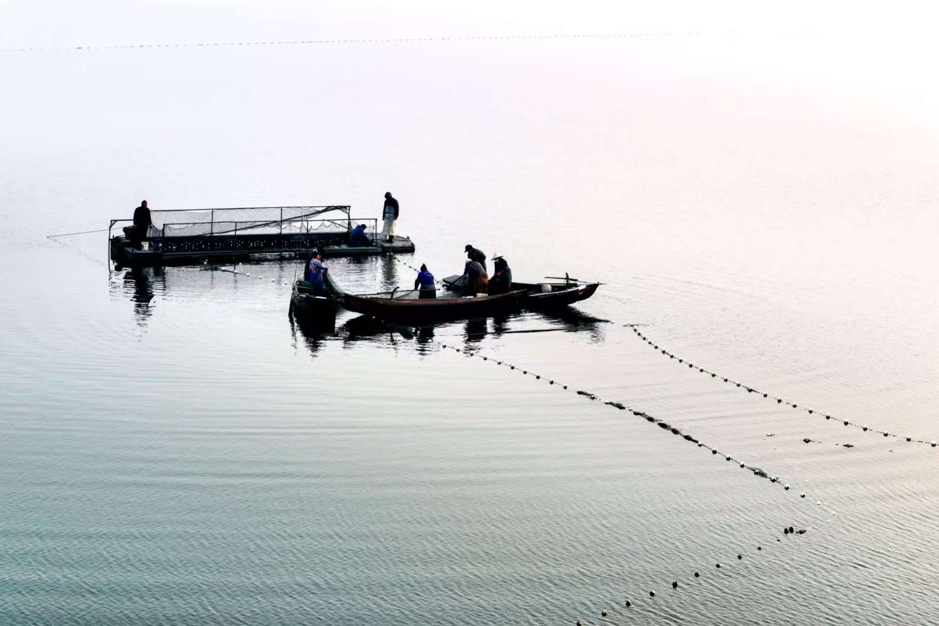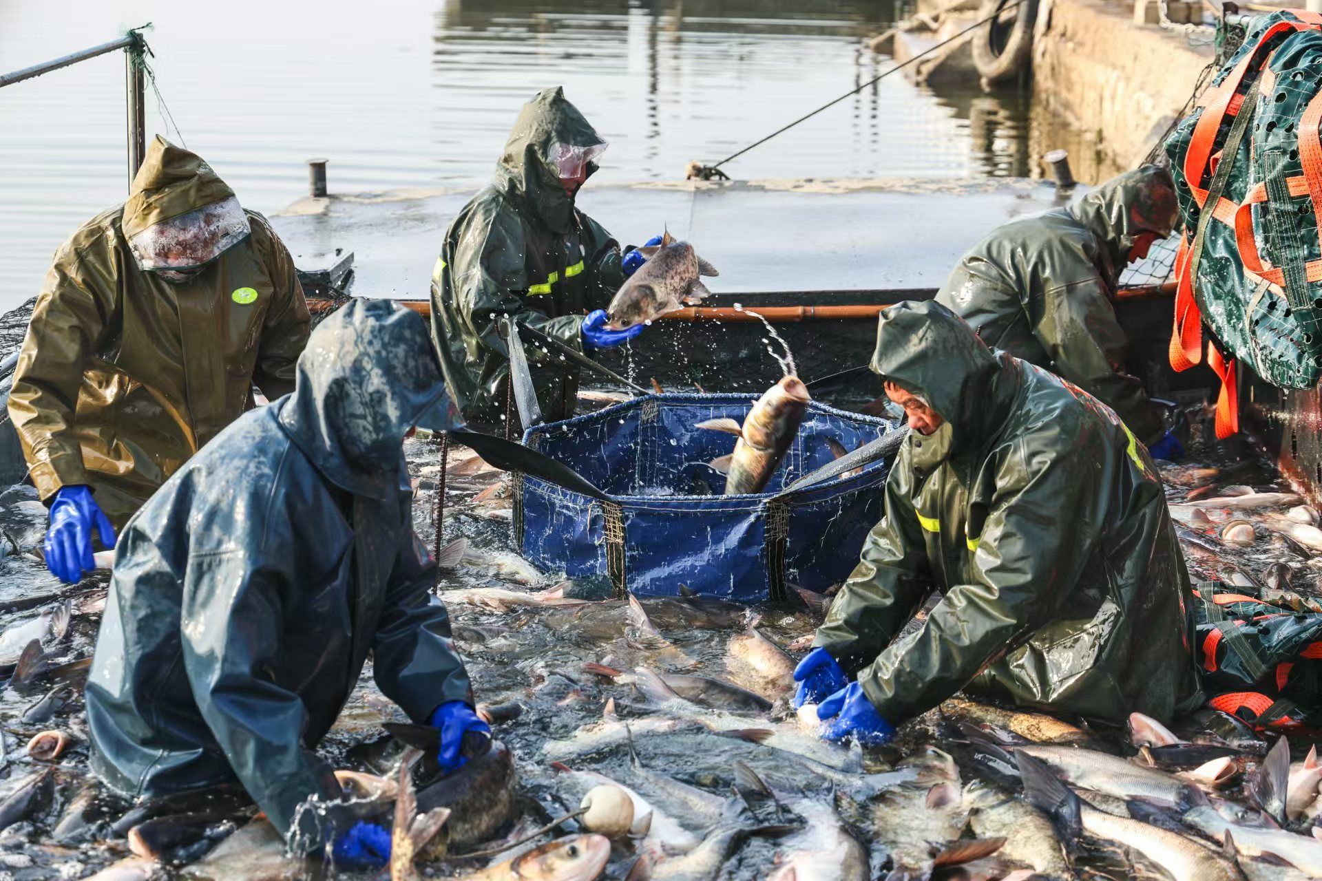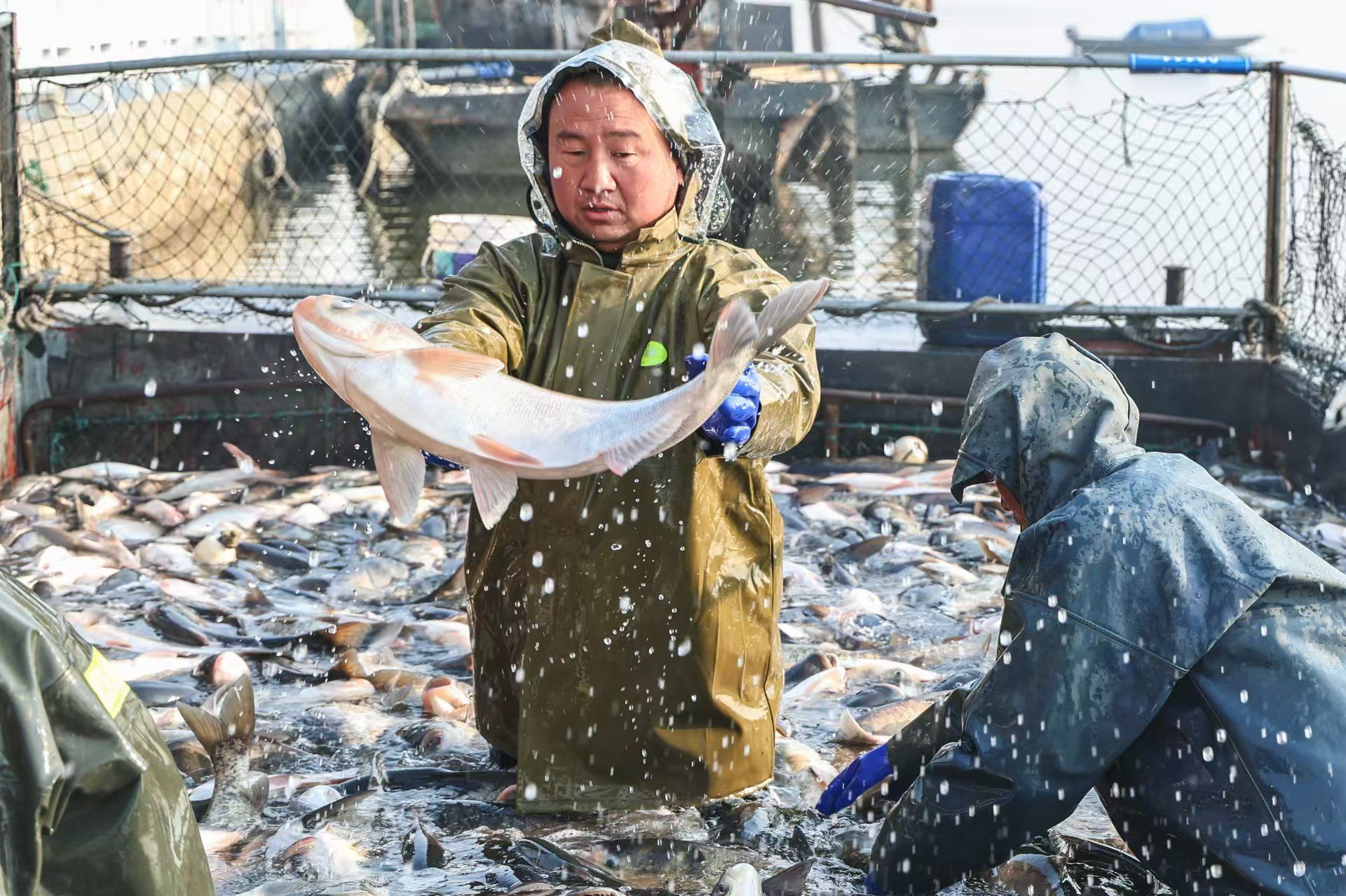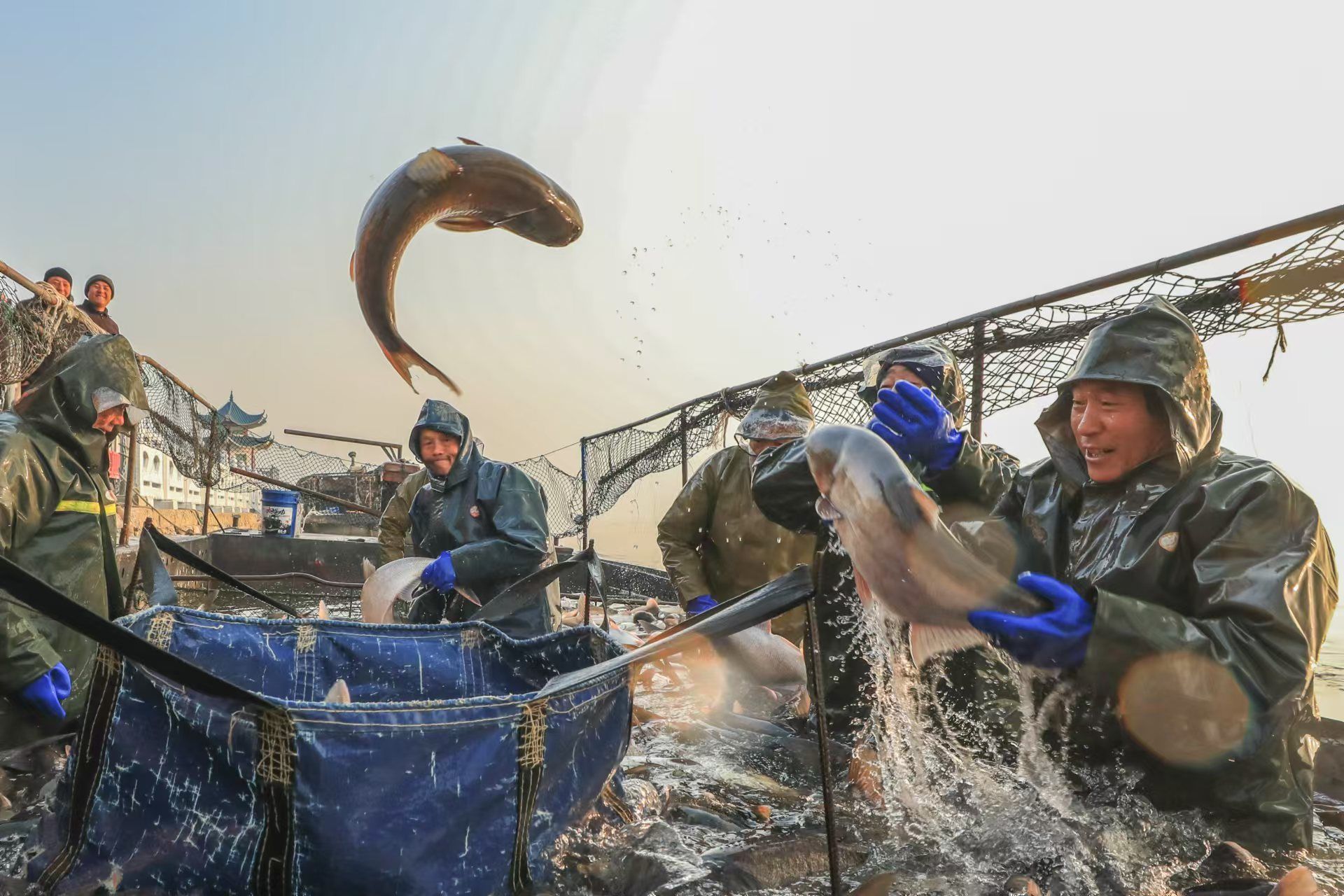 1月3日,在湖北省枣阳市小黄河水库,村民们正在忙着捕鱼、分类、装运鲜鱼供应市场。小黄河水库采取以水养鱼、以鱼净水、人放天养的生态养殖模式养殖花鲢、白鲢、鲤鱼等。当天,共有约15万斤鲜鱼供应广东、四川等地。