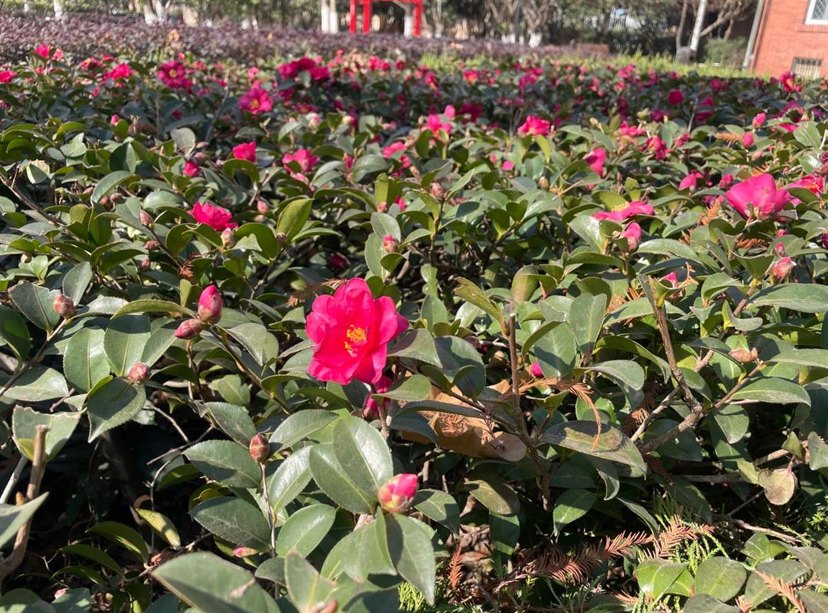 茶梅在武汉公园里,多是一片片的,所以花盛放后,红润得特别有气势。