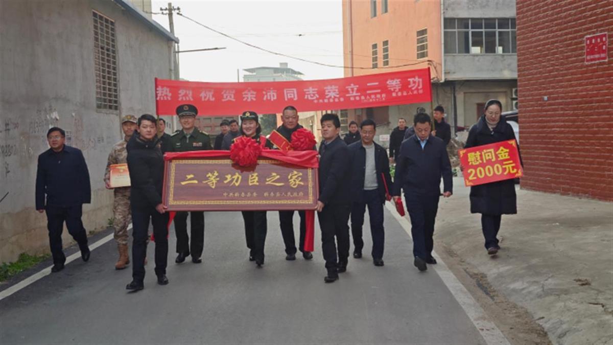 湖北省黄冈市蕲春县慰问组日前带着立功喜报和“二等功臣之家”牌匾,到该县现役军人余沛家中送去二等功喜报。伴随着喜庆的锣鼓声,军地领导为余沛及其家人佩戴“二等功臣之家”绶带,宣读立功通令。邻里乡亲们闻讯而来,共同见证这一光荣时刻。
