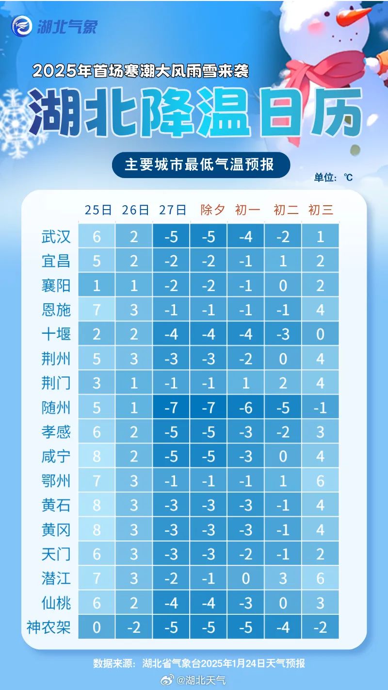 预计1月24日下午至26日,我省自北向南将有寒潮大风和雨雪天气,大部分地区气温下降 6~12℃,其中恩施、宜昌、随州、孝感、武汉、天门、仙桃等地下降 8~10℃,黄石、黄冈、咸宁下降10℃以上,27日全省最低气温降至-6~-2℃。期间有偏北风 4~5级、阵风6~9级,西部和北部山区有雨夹雪或雪,十堰、神农架、襄阳、宜昌等地的高山区有中到大雪、局地暴雪,请相关部门做好能源保供、防风防寒措施,公众做好健康防护。