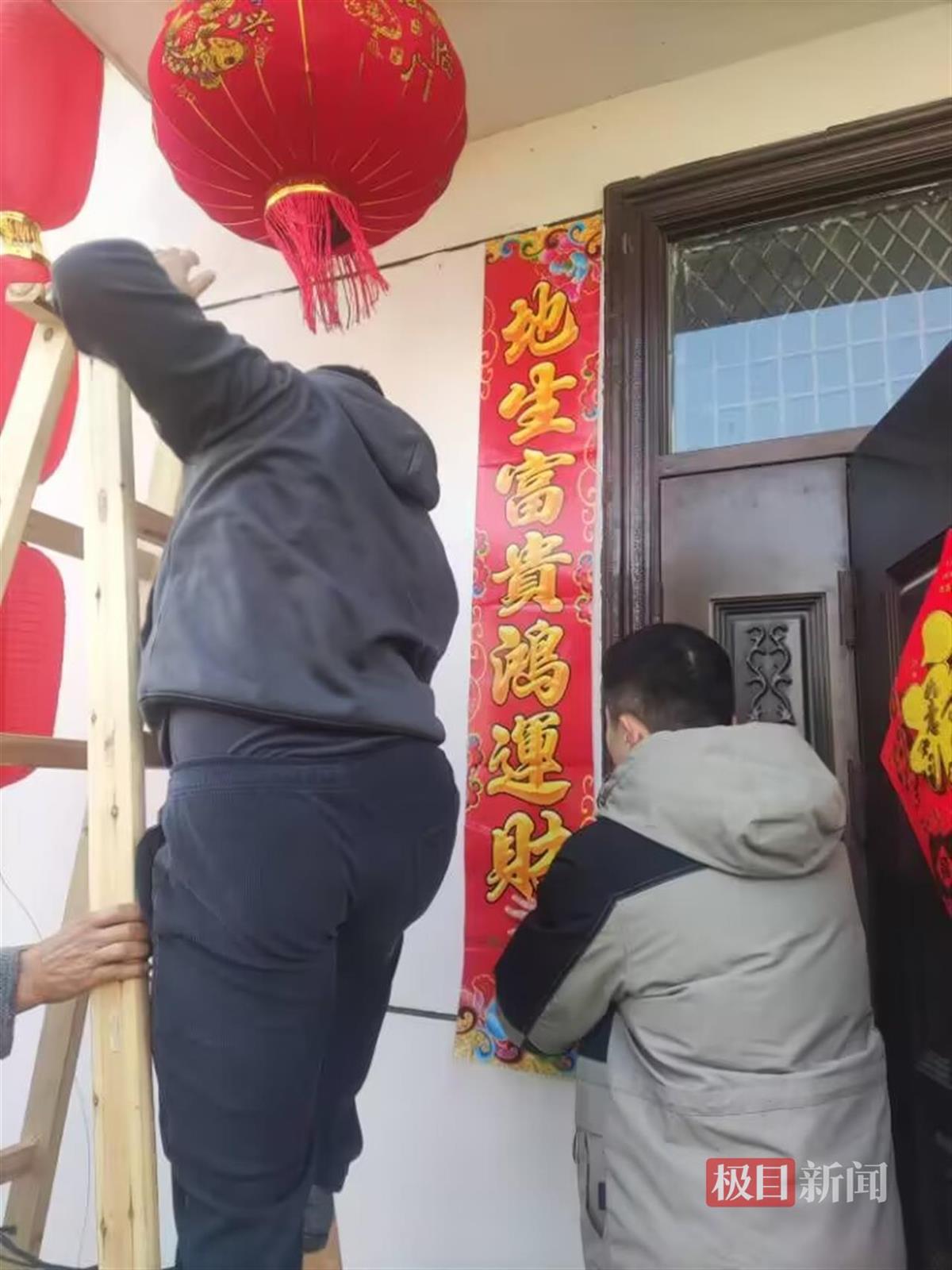 张先英的丈夫熊成龙和儿子在门口张贴春联