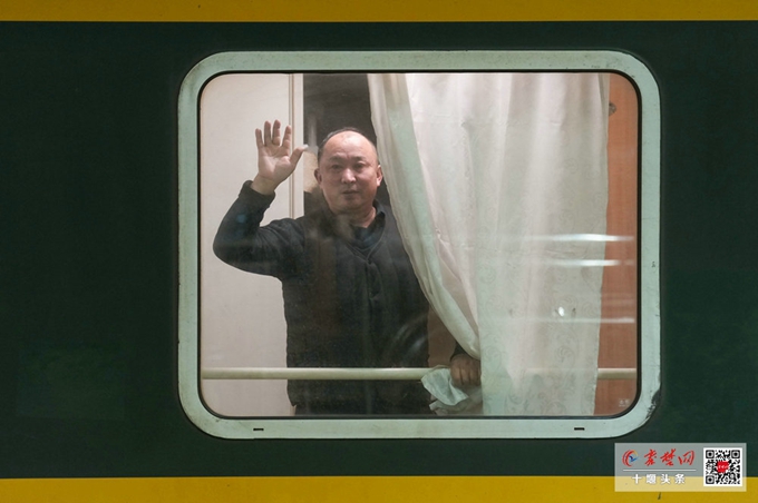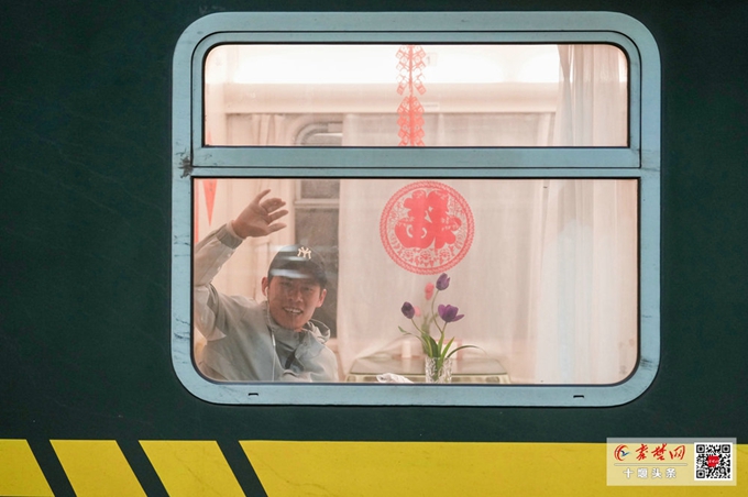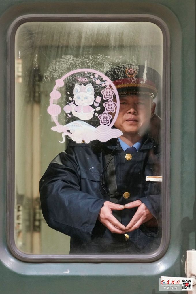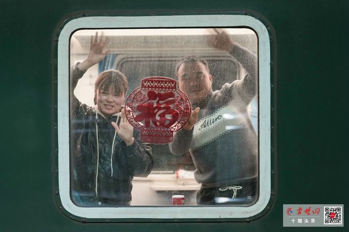 有人站在车窗旁,小心翼翼地在玻璃上贴上红色的窗花,为这趟归途增添一丝年味。