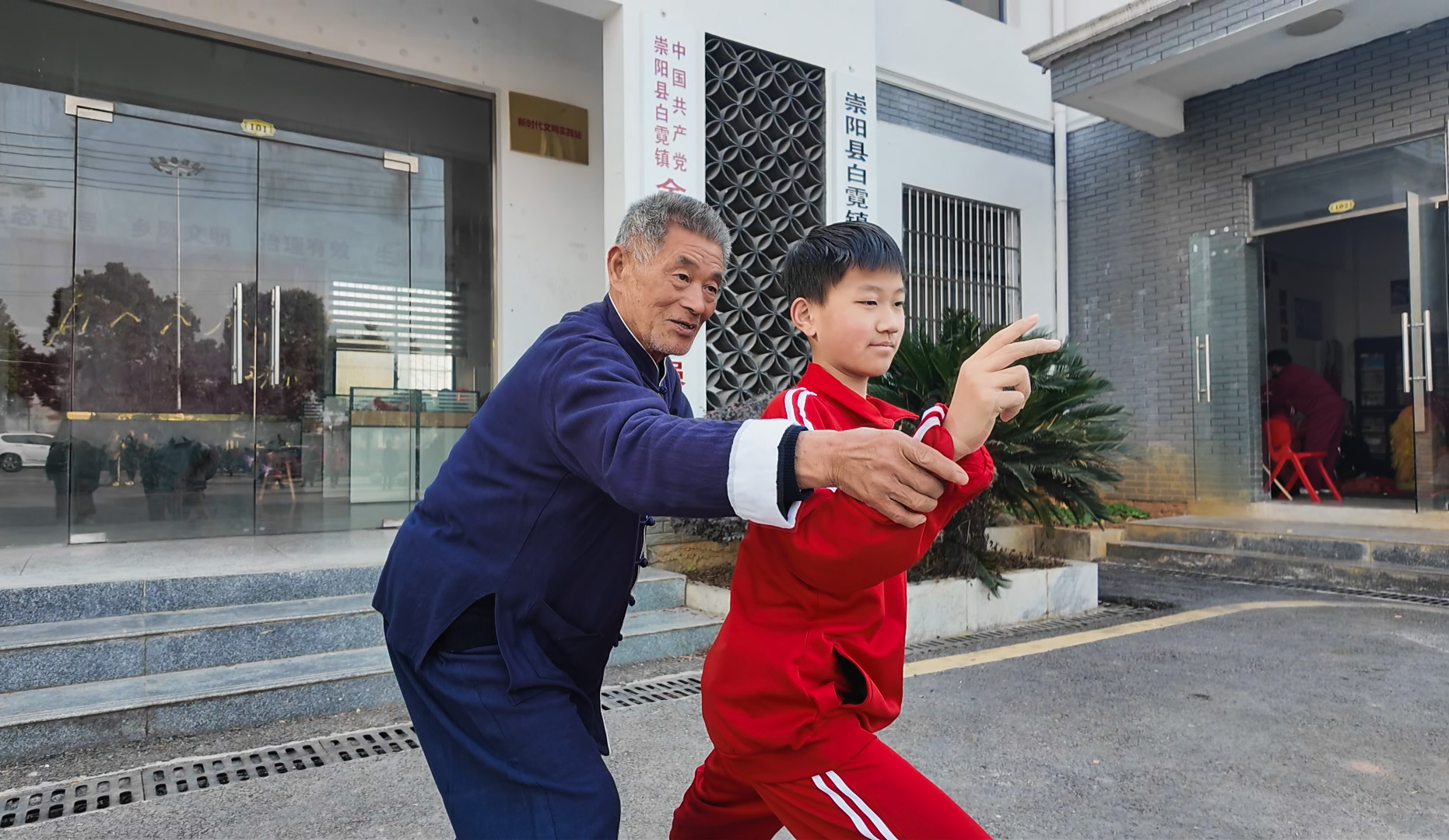 2月3日,正月初六,在崇阳县白霓镇金龙村党员群众服务中心的门前,73岁的字门矮桩拳第三代传人汪志远正带着年仅10岁的小学员训练拳法。今年寒假,每日早上6点,汪志远会准时出现在这里,手把手传授学员拳法。