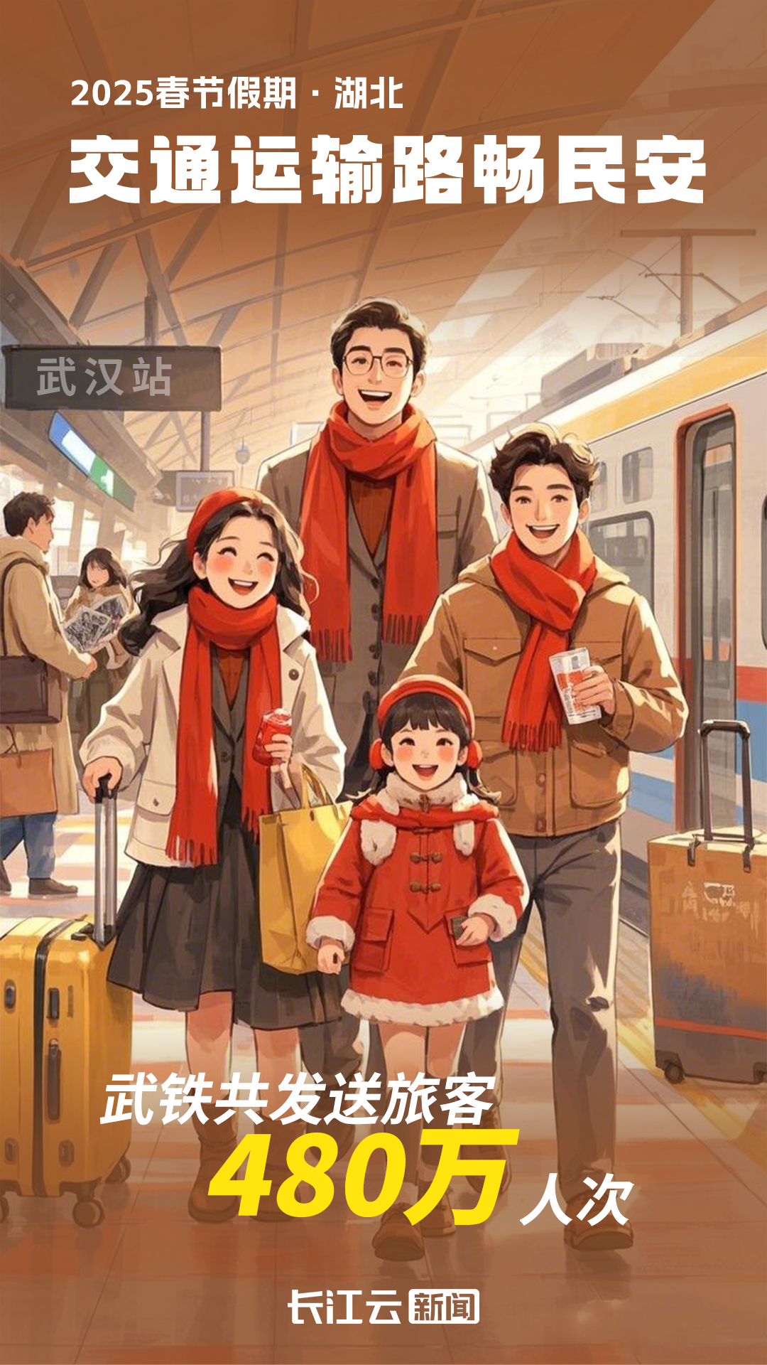 1月28日至2月4日春节假期,武铁共发送旅客480万人次,与2024年同期相比增加5%;湖北民航共运输旅客101.1万人次,同比2024年春节增长2.2%;春节期间,1300余名湖北高速交警始终坚守路面,全力疏堵保畅、护航人民群众安全出行。