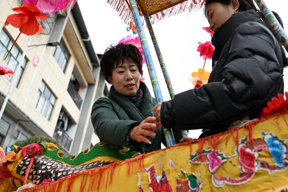 2月6日,在湖北省恩施州利川市柏杨坝镇,灯歌队队员在演出前穿戴衣饰。新华社记者 杜子璇 摄