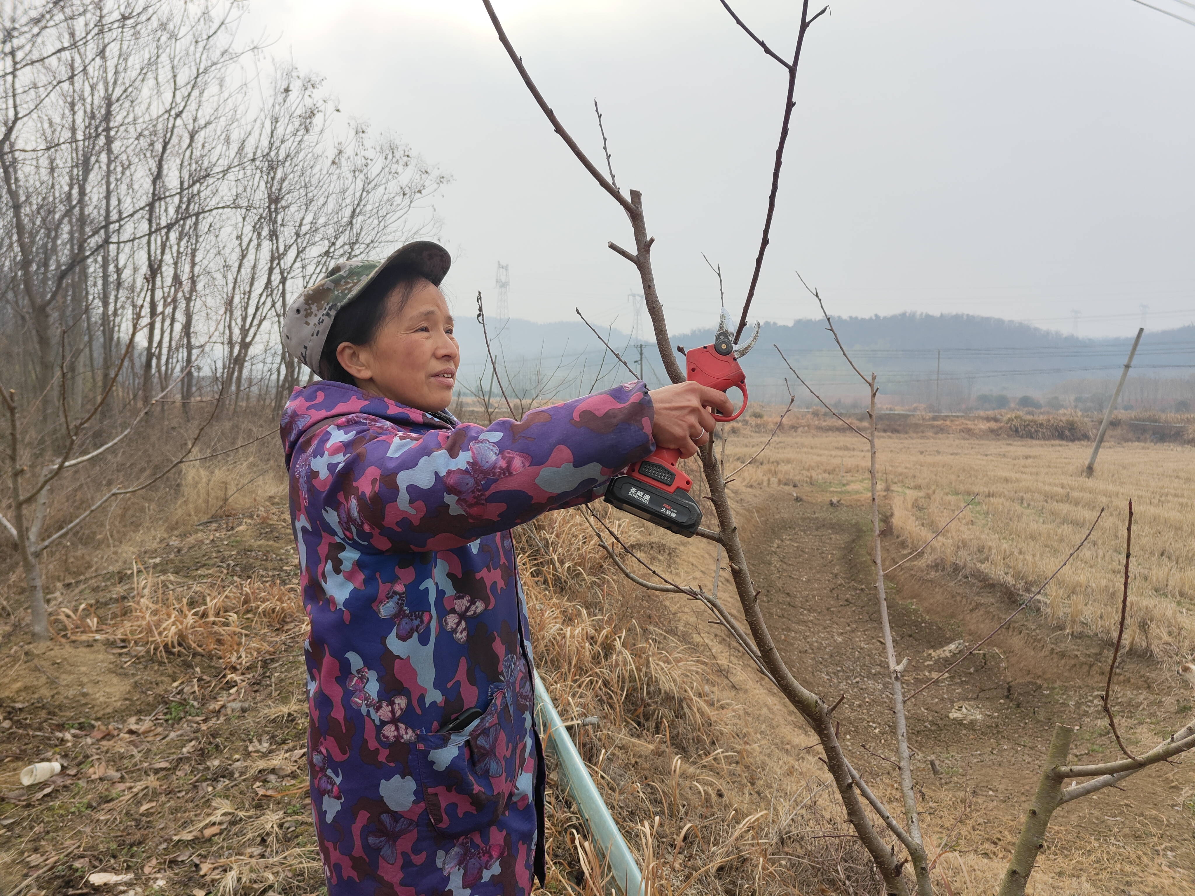 而在马鞍村,特色种植正孕育着无限的希望。村民陈莉起了个大早,提着工具为2000多棵桃树修剪枝条。她告诉记者,2000棵桃树围绕600余亩水田种植,采用了虾稻树共作的创新模式。这种模式不仅提高了土地的利用率,还促进了农田生态系统的可持续发展,同时带来了可观的收入。她说:“现在正是桃树修剪的关键时期,我们要剪掉多余的枝条,让桃树集中营养,提高开花率和挂果品质。希望今年的桃子能长得又大又甜,卖个好价钱。”