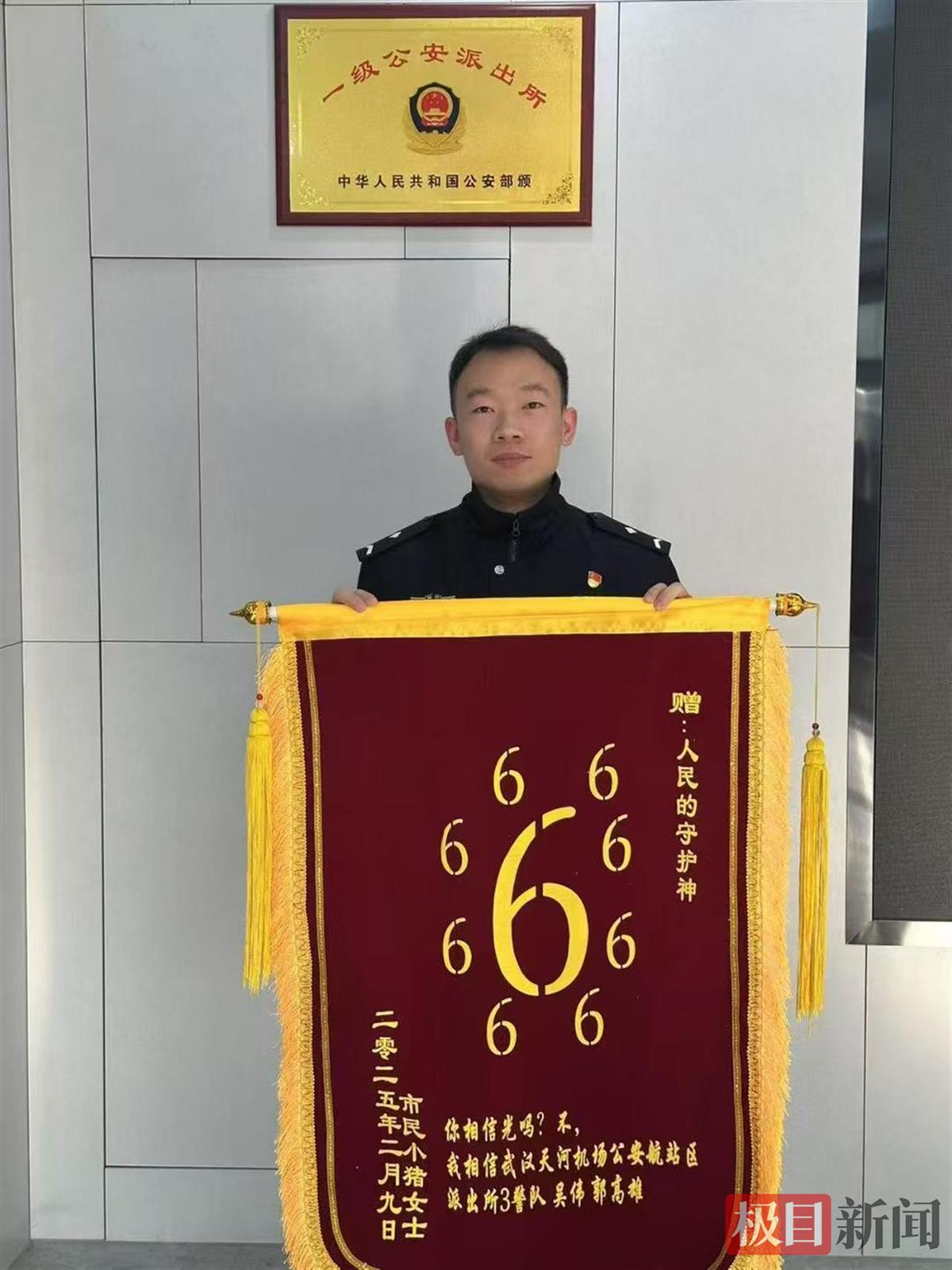 近日,王女士远程定制了一面印满“6”的锦旗,送到湖北机场公安局民辅警手中。锦旗上面写着:“你相信光吗?不,我相信武汉天河机场公安航站区派出所3警队……”